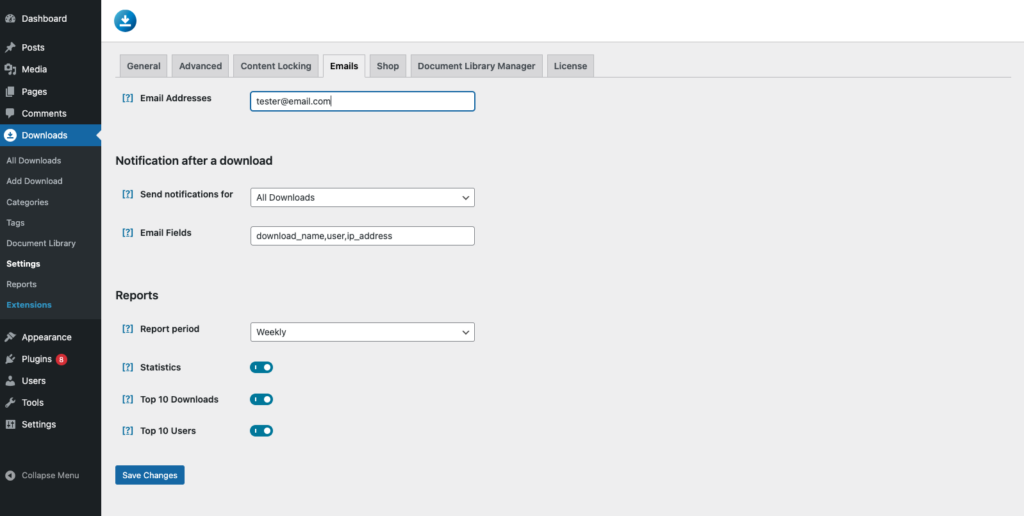 After installing the extension head over to your WordPress dashboard > Downloads > Settings > Emails